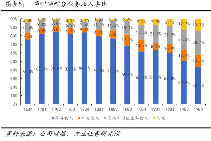2.总营收同比提升74%,业务多线条发力,游戏收入占比进一步降低,直播与增值服务率先发力,平台广告价值伴随出圈配合其独特营销生态有望进一步提升。19Q4营业收入20.08亿元(YoY+74%,QoQ+8%),手游收入占比43.4%,公司联运游戏占目前游戏总收入的25%,未来将继续深化ACG主题和高质量游戏合作渠道,与行业领先游戏开发商合作,利用二次元专业领域优势扩大全球范围的游戏发行。随着顶级内容和流量主播的入驻,公司加码直播领域,带动平台用户变现的深化,直播用户在平台用户的渗透率及用户付费与传统直播平台相比仍有巨大成长空间。社区生态为广告商提供稳固的受众群体,平台品牌知名度的提高和高效的广告效果转化将使公司成为更多广告主的首选合作伙伴,扩大平台广告主预算所占份额。