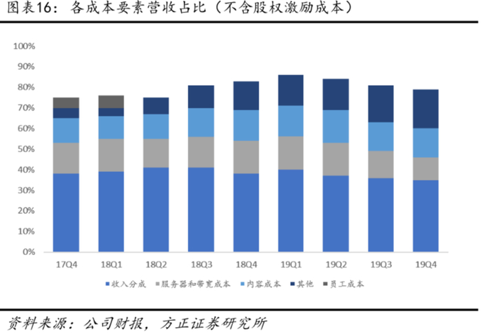 19Q4毛利3.98亿元(YoY+101.9%,QoQ+13.28%),毛利率20%(YoY+2.8pct,QoQ+0.9pct)。毛利率19年本季度同比上涨幅度较上一季度增加,原因主要为,随着营业收入同比大幅增长,带宽及服务器成本得到摊薄,具备一定经营杠杆。而收入分成及内容成本占比也得以改善,尽管用户规模增幅仍然低于两项成本同环比增速,但针对用户的变现带动收入快速提升,公司在内容上的投入逐渐显示出效率。同时从营收板块上来看,高毛利的广告业务收入占比提升及本季度新增的付费用户推动毛利率提升。