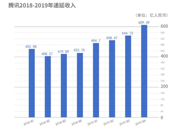 从递延收入更能准确刻画游戏业务的复苏。2019年第四季度时,游戏业务的递延收入为609.49亿人民币,同比增长43.83%,环比增长高达11.89%,较第三季度时的环比增速高出近5个百分点。