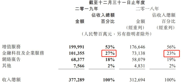 翻看腾讯财报,智通财经APP发现,金融科技及企业服务在2019年的表现较为亮眼。从收入增速上看,该业务增速为38.58%,远高于增值服务的13.22%以及网络广告的17.73%。从收入结构上看,该业务2019年的占比为27%,较2018年的23%提升4个百分点,规模日益壮大。