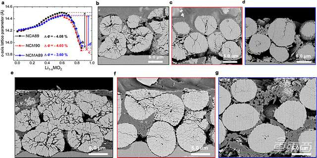 上文描述中已经提到,NCMA89电极较难出现H2-H3的不可逆相变,其具备较强的机械稳定性。Un-Hyuck Kim团队的实验也证明了这一点,在多次充放电循环后,NCMA89电池正极材料的微裂纹明显少于NCM90与NCA89电池。