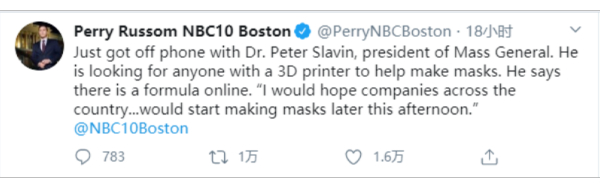 3月20日,美国媒体NBC10 Boston记者佩里·鲁索姆(Perry Russom)通过社交媒体透露,麻省总医院院长彼得·斯莱文Peter Slavin正在寻找拥有3D打印机的人,希望其能帮忙生产口罩,并表示“希望全国的3D打印公司从今天下午就开始生产口罩。”