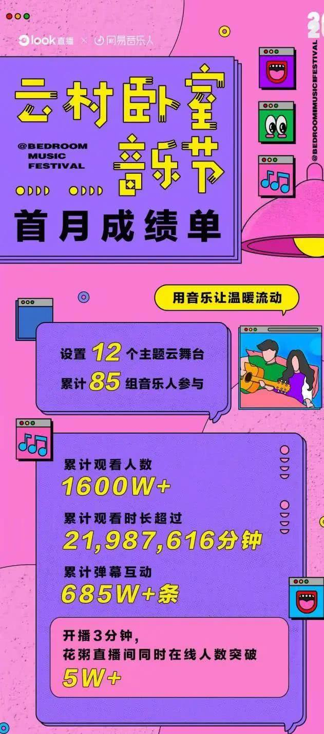 根据前几天网易云音乐给出的数据显示。截止到3月初,共有85组音乐人参加云村卧室音乐节在线“云演出”累计观看人数已超1600万,累计观看时长超2198万分钟,累计弹幕互动685万条。