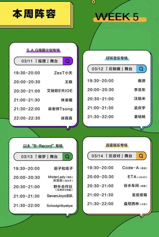 以“云村卧室音乐节”为例,从2月份开始,每天都有不同主题的音乐舞台在线上开放,其中包含“国风”、“嘻哈”、“复古”、“声系武汉”等等。每个主题直播都会邀请同类型音乐人“拼盘”表演,类型划分更加明确,用户感知也更加多元。
