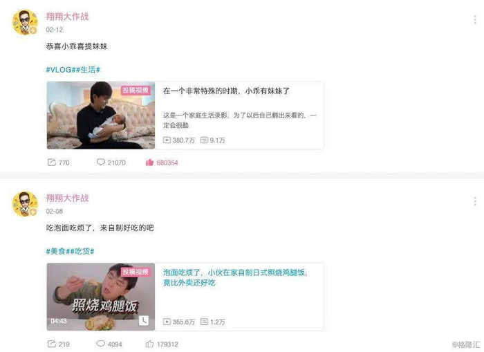 以B站知名UP主翔翔大作战为例,他是一个分享美食和生活的UP主,在今年2月12日,他发布了一则自己喜提二胎的投稿,同样获得380万播放量和超过68万点赞。从留言和转发的数量来看,这则投稿比他的“正经”投稿数据还要好。这自然是注意力资源的某种集中。