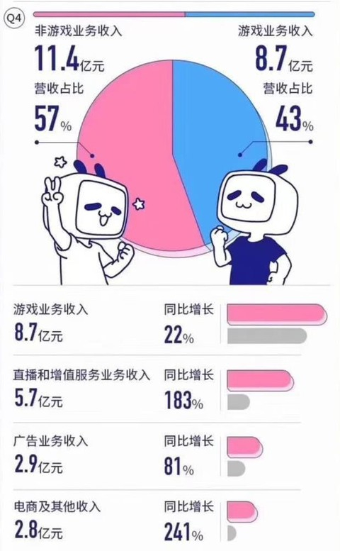 用户规模和付费表现双双增长,b站营收也呈现出大好态势:2019Q4收入达到了20.78亿元,相比去年同期的11.56亿元增长74%;其中手机游戏收入8.7亿元,直播和增值业务收入5.7亿元,广告收入2.9亿元,电商和其他收入2.8亿元。非游戏业务收入占比57%,营收结构发生改变。