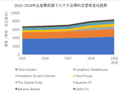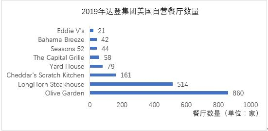 一般而言,国际上将餐饮企业划分为三大类:一是快餐类,二是休闲饮料类,三是正餐类(Full-Service Restaurants)。而达登集团就是一个涵盖众多类型的正餐类餐饮集团,是当之无愧的餐饮界巨无霸。截至到2019年5月26日,公司通过附属子公司的方式在和共有1785家自营餐厅,除此之外公司在世界范围内还有70家由第三方运营商经营的特许经营餐厅。这些餐厅的品牌包括 Olive Garden、LongHorn Steakhouse、 Cheddar’s Scratch Kitchen、Yard House、The Capital Grille、Seasons 52、Bahama Breeze以及Eddie V’s。