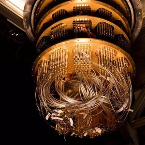 其中的一个圆柱形容器外壳已经被移除,露出了里面由钢和黄铜组成的多层次、错综复杂的内部结构,它被称为“枝形吊灯”。这基本上就是台超级冰箱,越往下层温度越低。在底部,保持在绝对零度以上、大约只有头发宽度大小的真空中,可以用肉眼看到类似普通硅片的东西。但它上面没有蚀刻晶体管,而是由微小的超导电路构成。在这种低温下,这些电路的表现就好像它们是遵守量子物理定律的单个原子。它们就是所谓的量子比特,即量子计算机的基本存储单元。