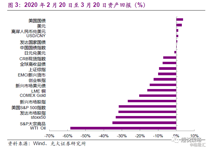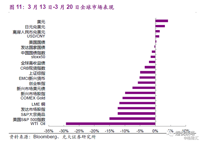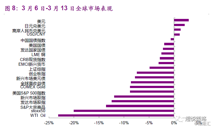 3月6日-3月13日期间,权益、债券、大宗品均下跌。美国10年期国债收益率从3月9日的最低点0.54%回升至0.94%,而相比于美国国债指数在3月6日-3月13日期间仅小幅下跌1.94%,新兴市场美元债指数和高收益债指数分别下跌7.76%和8.60%,体现对信用风险的担忧。权益方面,美国三大股指平均下跌9.1%,两次触发熔断;欧洲STOXX50指数下行20.0%;中国上证综指下跌4.8%,创业板指下跌7.4%。MSCI发达市场、新兴市场股票指数分别下行12.5%和11.9%。商品方面,原油依然领跌,WTI原油价格下跌23.1%,S&P大宗商品指数下跌13.5%,CRB现货指数下跌2.8%,LME铜价格下跌2.53%。