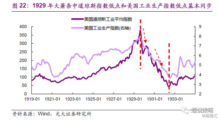 从市场表现看,尽管道琼斯指数经过最初50个交易日的恐慌性下跌48%后,出现了约4个月时间约48%的反弹,但很快再次下跌,指数的低点与工业生产指数代表的基本面的低点基本一致。