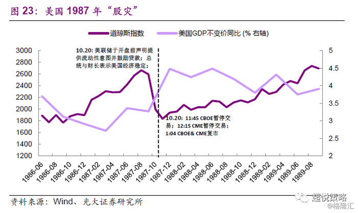 中长期来看,因泡沫破裂而带来的恐慌性下跌,市场之后的反应将逐步回到基本面变化主导。1987年10月美国指数大幅下跌后的快速反弹,得益于及时的政策对冲和良好的基本面。10月20日,在美股开盘前美联储发表紧急声明,已准备就绪为支撑经济和金融体系提供流动性,当天联邦基金利率下行约60bp;里根总统和财长贝克均表示,“这次股市崩盘与美国健康的经济是不相称的,美国经济非常稳定”,此后还有一些关于续贷、股利公司回购、干预外汇稳定、阻断程序化交易的措施。10月20日美股开盘后就开始反弹,并在2年后回到1987年的高点。