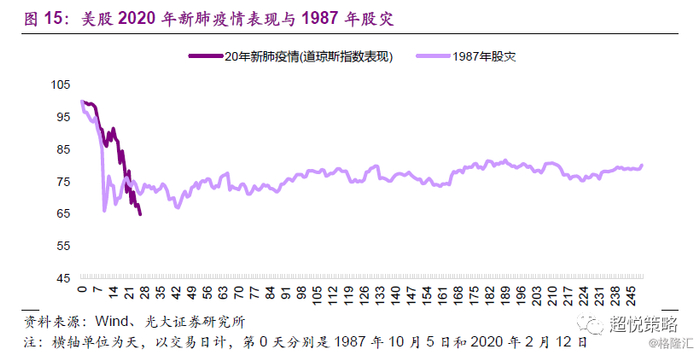 从下跌幅度上看,道琼斯指数自2月13日以来的27个交易日累计下跌34.7%,和1929年9月3日之后50个交易日下跌48%、2008年9月15日之后49个交易日下跌34%、2000年3月19日之后纳斯达克指数26个交易日下跌34%的同样短时间快速的下跌很相似,都反应了初期投资者恐慌的结果。