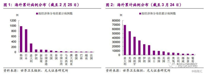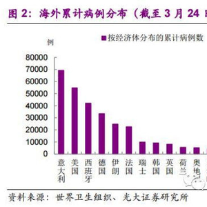 近期新冠疫情在海外仍呈现加速蔓延趋势。自2月20日以来,中国大陆以外地区新冠疫情病例显著增加,到2月25日疫情主要在韩国、日本等亚太地区扩散,但随后欧洲、美国的疫情也有扩散迹象,截至3月24日,中国大陆以外的新冠疫情病例34.1万例,意大利、伊朗、西班牙、德国、法国病例数居前。