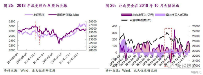 随着对外开放的不断扩大,A股与全球市场的联动性正在加强,即便没有基本面的改变,美股下跌往往从情绪和资金流等方面给A股造成压力。以2018年末美股与A股共振下跌为例,2018年9月底美联储再次加息,10月美联储主席鲍威尔力挺美国经济,导致10年期美债收益率快速上行,一度突破3.2%的关口,美股也出现较短期但快速的下跌,2018年10-12月道琼斯指数最大跌幅达到18.8%,2018年10月中旬陆股通累计外资流出接近200亿,这一期间A股也出现了较大幅度调整,而随着11月美股快速下跌结束,国内逆周期调节力度加大,A股的调整也基本完成,进入震荡期。