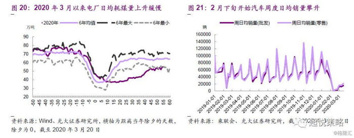 本次疫情对经济影响方面,中国的疫情防控经验表明,只要采取了及时、正确的防控措施,疫情是能够得到较好控制的,而随着国内战“疫”进入尾声,经济活动得到加速恢复,疫情只是将经济按下了“暂停键”。截至3月20日六大电厂日均耗煤量已经恢复至2019年的80%,3月16日全国调度发电量较2月底上升9.9%,下游可选消费如汽车的销量也出现环比改善,显示终端需求的复苏。
