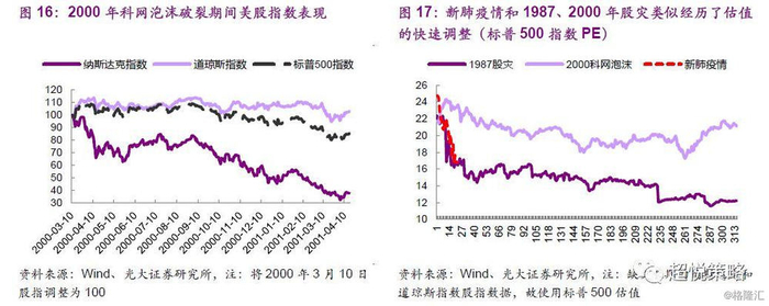 2000年后互联网泡沫破灭后如何演绎:美股因泡沫破裂而带来的恐慌性下跌已然进入下半场,之后将逐步告别恐慌、回到基本面变化主导,进入到等待数据的磨底阶段。本次美联储快速政策的及时对冲有利于缓解美股短期再次出现崩盘式下跌,但考虑到对二季度全球经济增长的悲观预期,且疫情何时见顶仍存在不确定性,市场大幅反弹的动力也不大。