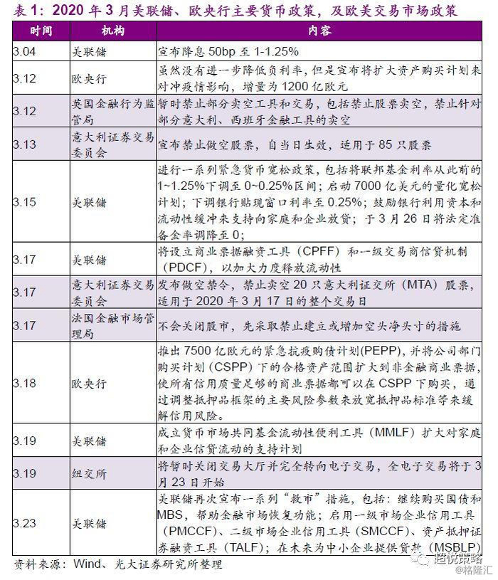 在3月13日之前,美国和欧洲国家无论在疫情应对还是市场流动性释放方面都相对保守,各国股票市场也或多或少反应了对疫情控制不力的悲观预期。3月中下旬,美国和欧洲国家陆续开始展开更加强力的疫情防控措施,也开始对金融市场提供大规模的流动性支持,恐慌进入下半场。对全球经济影响最大的美国自3月13日进入国家紧急状态,同时美国国会众议院已通过免费开展新冠病毒检测的法案。欧洲缺乏统一的中央政府,各国疫情防控力度各有差异,如意大利自3月10日起封锁全国,3月16日开始德国对部分边境进行管控,并对公共活动进行管控,而英国则以自我隔离为主。