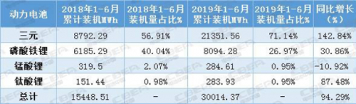 动力电池应用分会研究部统计数据显示,2019年上半年中国新能源汽车动力电池装机总量中,三元锂电池和磷酸铁锂电池占据绝对优势,占比之和高达98.11%。同时,二者的装机量占比差距逐渐拉大,由2018年同期接近17%的差距骤增至44%。