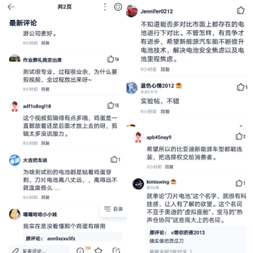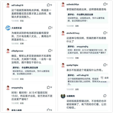 视频发布后在网络上引起热议,其中质疑最多的话题是,网传视频有剪辑的痕迹。有网友表示,经过剪辑的内容可信度不高,或许针刺测试过程中刀片电池的表现并不像视频中展示的那么好。