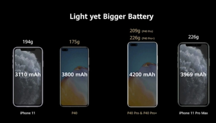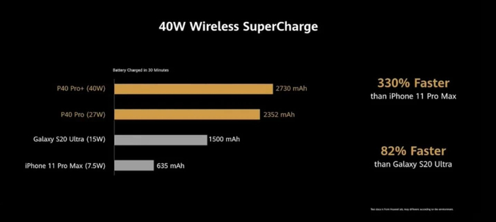 尽管在电池容量方面华为P409系列不占优势,但华为依然给了我们惊喜。P40系列上延续使用了在Mate30 Pro上发布的40W有线快充技术,同时还将40W的无线快充技术正式落地到P40 Pro和P40 Pro+上。华为在发布会上给出的官方数据显示,40W的无线快充可以在30分钟为P40 Pro充满2730毫安时的电池容量。