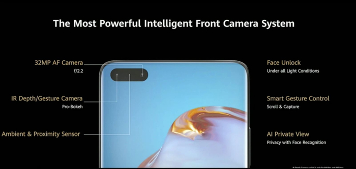 前置镜头方面,P40系列拥有一个前置镜头模组,包含一个3200万像素的前置镜头,红外摄像头(用于夜晚解锁)和一个人物动作传感器。三款手机前置镜头唯一的区别是P40的前置镜头不支持自动对焦,而P40 Pro和Pro+支持自动对焦。