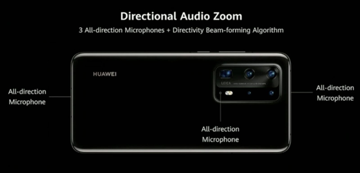 华为P40系列也使用了智能追音技术,手机上拥有三个指向性的mic,通过检测录像时人物主体的声音,来抵消周围的噪音。之前苹果、三星都在自家的旗舰手机上使用过这种技术。