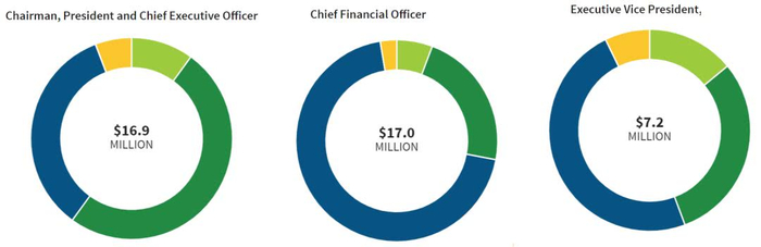 下面是2017年波音CEO(首席执行官)、CFO(首席财务官)、EVP(执行副总裁)三个高管的薪酬结构,其中,蓝色是股票激励部分,分别占到总薪酬的34.2%、69.4%、48.5%。