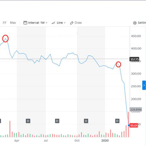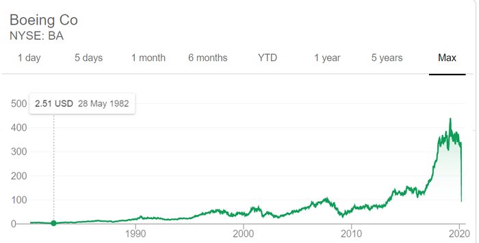 在1个半月前,2020年2月10日,波音股价还有340美元。