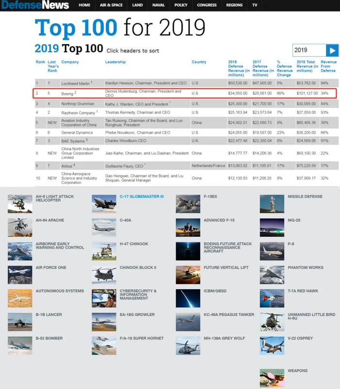 它是全球第2大国防承包商,军售武器数量仅次于洛克希德·马丁。2018年,波音公司的防务收入高达340亿美元,占全部收入的34%。