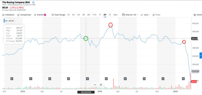 在一年多前,2019年2月25日,波音股价还在440美元。