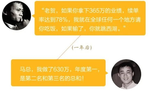 为此,他当众和马云打赌:拿下365万的业绩,78%的续签率!