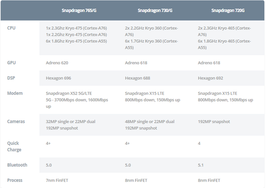 拥有Snapdragon 710、712、720G,730 / G,765 / G芯片的手机代表如下: