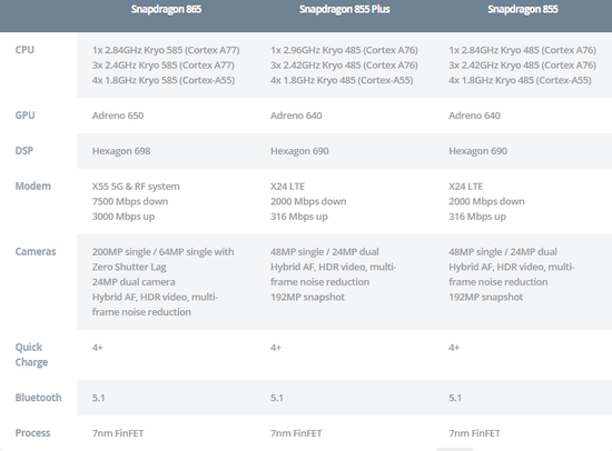就目前而言最新的处理器是Snapdragon 865,该芯片组的基本配置和时钟速度与现有855芯片组的基本配置和时钟速度相同,但是ARM最新的体系结构Cortex-A77 CPU内核增强了性能。它由一个2.84Ghz主核(Kryo 585)+三个2.4Ghz性能核(Kryo 585)+四个1.8Ghz效率核(基于Cortex-A55的Kryo 385)组成,具有高通公司的Adreno 650 GPU。