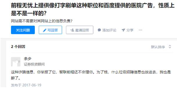 针对这一问题,其中一条回答是:“他们只提供信息并不审核信息的真实性,毕竟是广告性质的平台”。