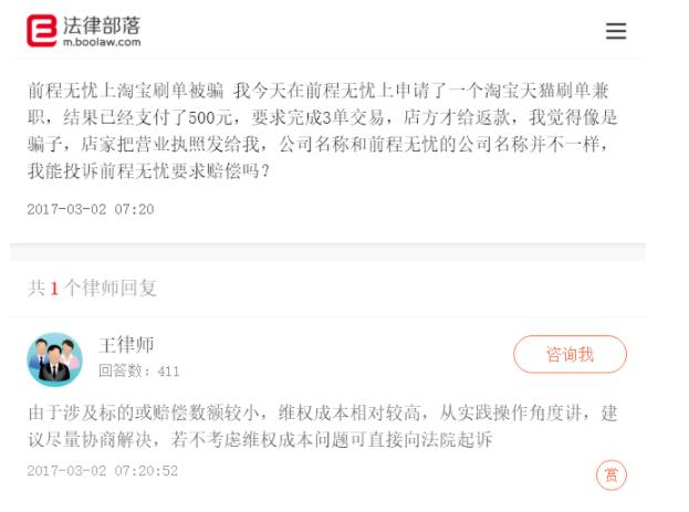 事实上,不仅仅是智联招聘,记者搜索“前程无忧刷单”,也有被骗的用户在网上寻求解决办法。比如以下这位: