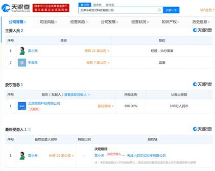 全资持股的“天津小陌范式科技有限公司”成立。注册资本100万元,最终受益人为陌陌联合创始人雷小亮,经营范围中有一项是“人工智能硬件销售业务”。
