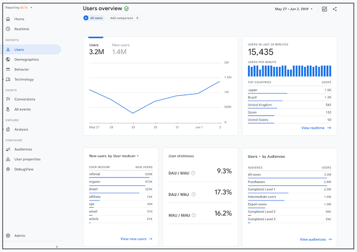 而在这次Google游戏开发者峰会中,主办方表示他们还将在Google Analytics的游戏报告服务中,进一步引入全新功能「App+Web properties(应用+网站媒体资源)」。这是 Google Analytics媒体资源报告中的新类型,具有跨平台整合数据的特性,能够披露专有的用户漏斗指标,并集中展示用户获取、留存率、互动度和获利等信息。