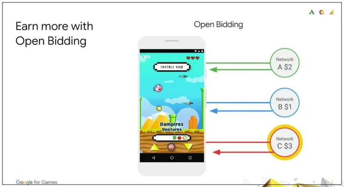 例如,Google此前推出的Open Bidding(实时竞价广告),便是AdMob的重点产品之一。它的作用在于,同一个广告位可以让多个网络联盟进行公开竞价,最终为开发者获取出价最高的eCPM来填充单个广告位。
