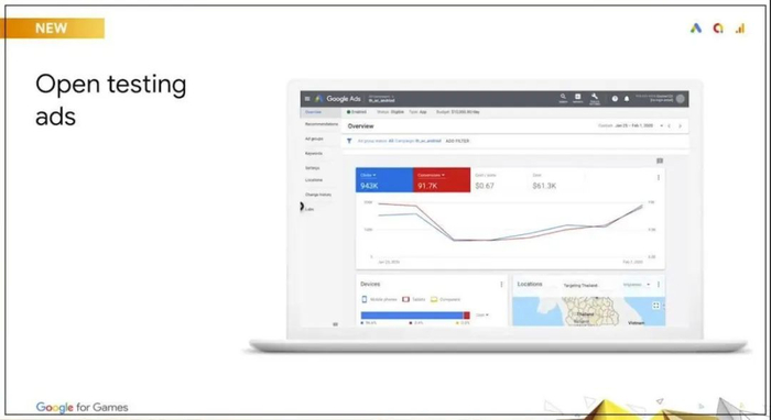 推广是接触用户的必要手段。Google在这方面也有技术支持。他们的App campaigns通用应用广告系列,利用机器学习,可根据预算多寡和定位目标,自动优化广告方案,从而最大程度地找到潜在玩家。