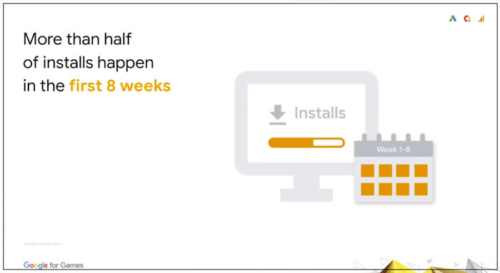 至于实现方法,则是在测试环节内,找到足量的目标用户,对游戏功能与内容以及用户留存率、广告素材、营收方案等进行全面测试。根据Google内部数据,有一半以上的安装是在应用发布后八周内完成的。