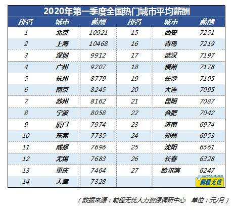 2020年伊始,一场突如其来的新冠疫情,让所有人都始料未及。随着企业逐步复工,疫情对企业招聘及薪酬有何影响,前程无忧人力资源调研中心针对2020年第一季度薪酬趋势、人才流动状况进行调研,结果显示,2020年第一季度27个热门城市平均薪酬较上一季度均小幅下降。
