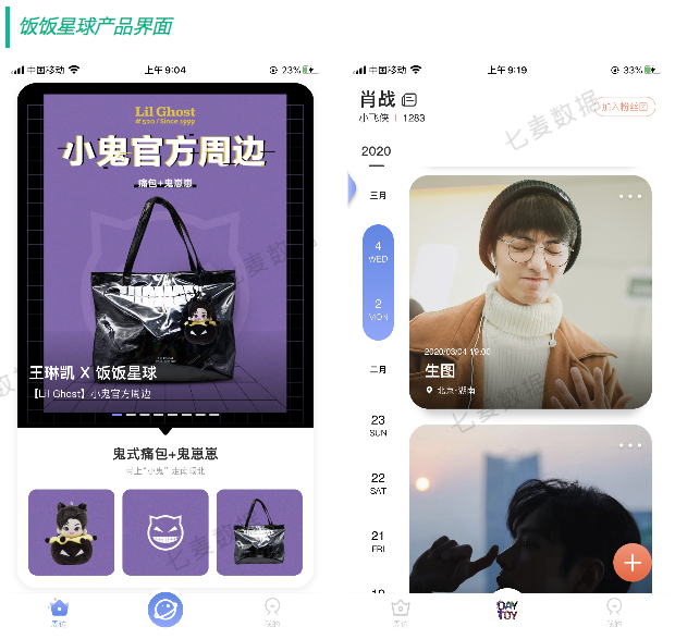 饭饭星球则是为粉丝打造的一款电商平台,于 2019 年上线,主要是让粉丝购购买明星的周边、代言的产品。因为在粉丝圈中,有一个不成文的规定,哪个明星带的货越多,就证明他(她)的影响力和商业价值越大。所以当有明星出了新周边、官宣新代言时,粉丝会在第一时间疯狂抢购,以此证明自家偶像的实力。不仅如此,在饭饭星球中,用户还可以定制明星专属周边,并与其他粉丝一起支持、应援自家偶像。