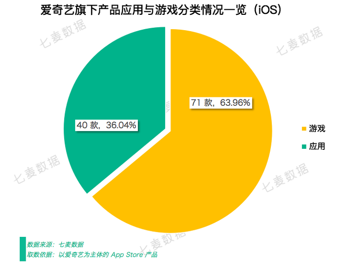七麦研究院发现,App Store 中以爱奇艺为主体上架的产品共有 100+,其中游戏产品占多数(包括下架产品),占比 63.96%。