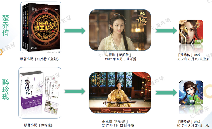 如楚乔传、醉玲珑两款游戏,是经由其热播剧爆红后,才被推出的。而电视剧是基于原著小说改编而成。从小说吸引用户阅读,打下一定的粉丝基础,形成 IP 后,再推出影视剧是目前行业中较为常见的一种形式。但再往后衍生出手游就不常见了,因为这需要的是平台有较强的技术和经济基础。