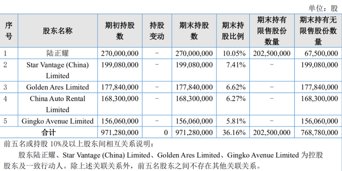 目前神州优车尚未公布2019年年报,从其2019年半年报来看,其第一大股东正是陆正耀,持有神州优车10.05%股份,与Star Vantage (China) Limited、Golden Ares Limited、Gingko Avenue Limited 为控股股东及一致行动人。