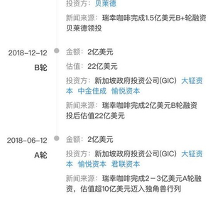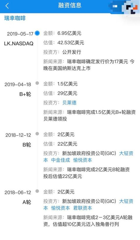 瑞幸咖啡从成立开始就备受投资人热捧,企查查数据显示,瑞幸咖啡上市之前曾经历三轮融资,共融得5.5亿美金。