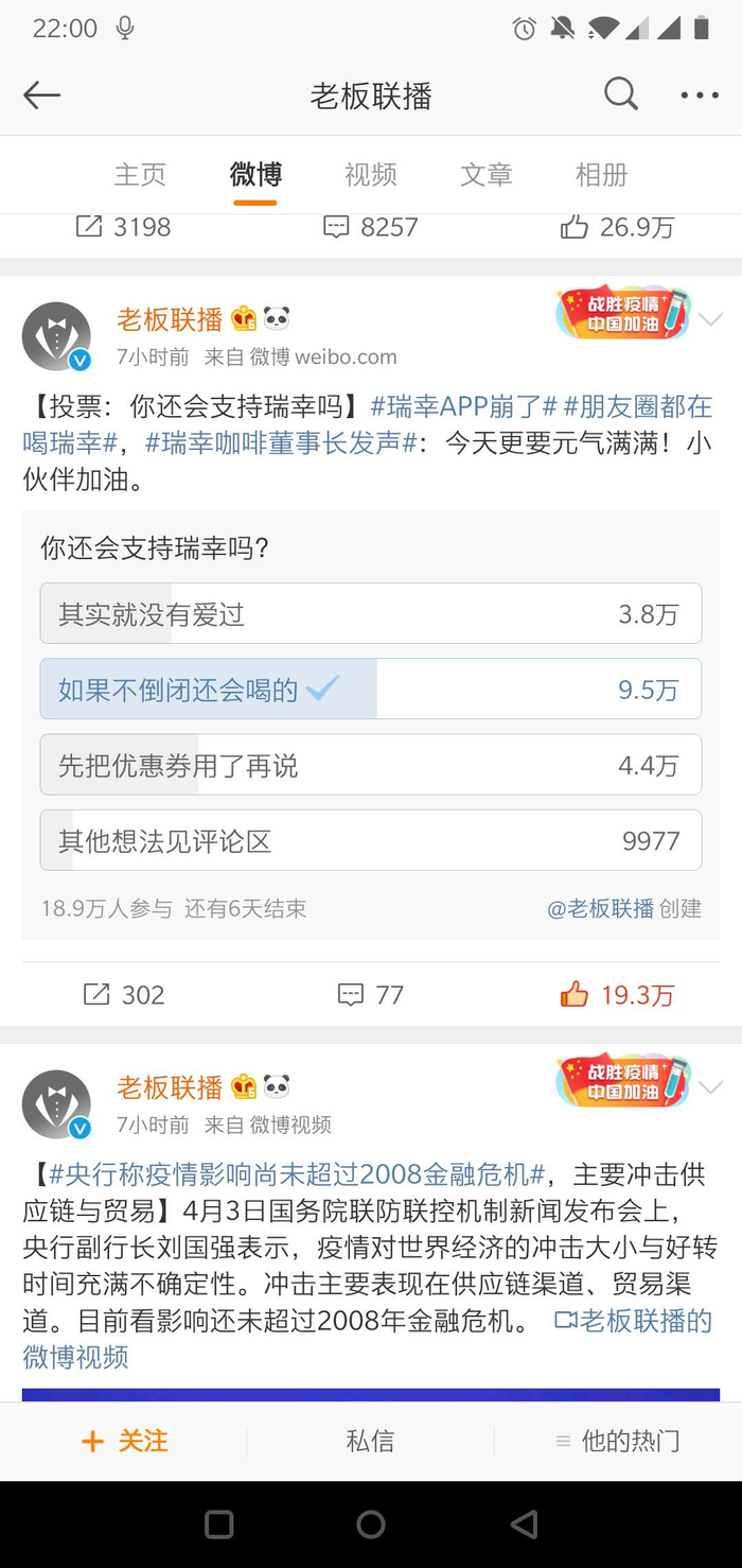 梨视频旗下《老板联播》在微博上发出的一个题为“你还会支持瑞幸吗?”的调查,调查结果显示,参与投票的19.8万人中,10万人选择“如果不倒闭还会喝”,另外8.8万人选择“其实就没有爱过”、“用完优惠券再说”。