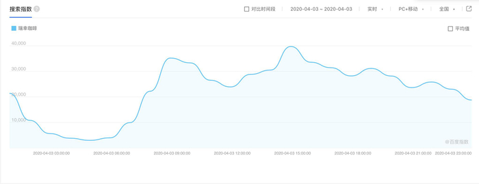 百度指数数据显示,在瑞幸发布自查结果之后,有关“瑞幸”的搜索量飙升,在晚上10点到达有史以来最高的顶点,并在4月3日上午九点和下午两点又迎来两个波峰。