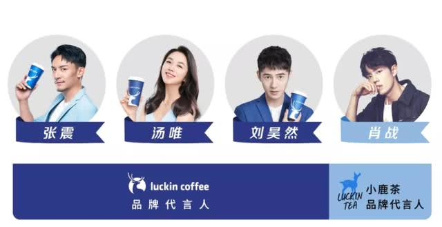 瑞幸在营销上的手笔很大,前后共聘请了四位代言人:张震、汤唯、刘昊然、肖战,迎合了都市年轻白领人群,小蓝杯也非常有设计感。为了避免大家对代言人产生误会,据瑞幸官方微博的解释:luckin coffee的品牌代言人是张震、汤唯、刘昊然,小鹿茶的品牌代言人是肖战。