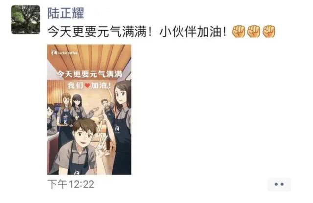 更“励志”的是,瑞幸大股东、董事长陆正耀发朋友圈打鸡血:“今天更要元气满满!小伙伴加油!”